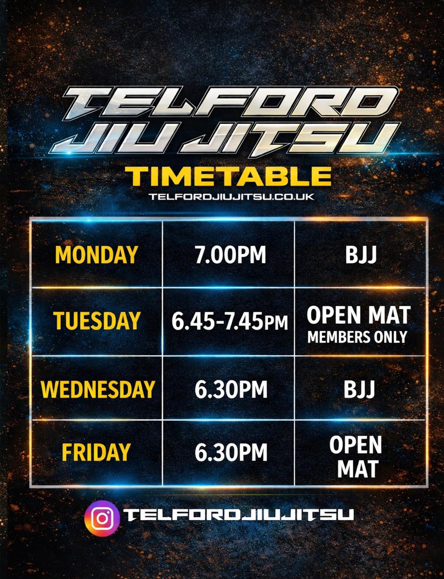 The schedule offers structured Brazilian Jiu-Jitsu classes , with two open mat sessions for drilling, sparring, or reviewing techniques, including one reserved for members only.